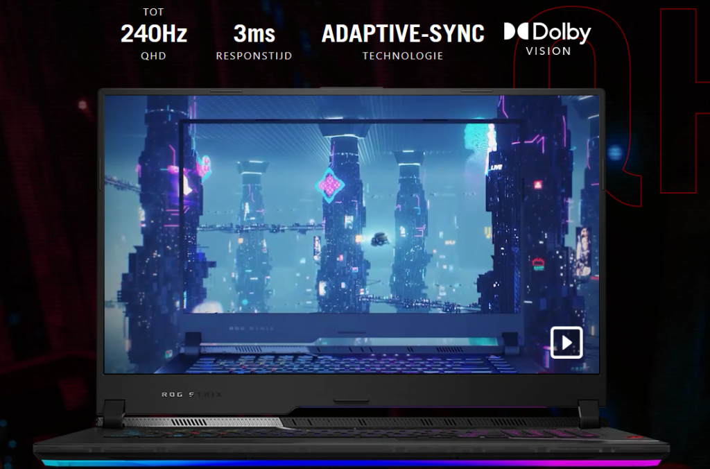 De ROG Scar 17 die wij hebben ontvangen voor review, is uitgerust met een 1440p-scherm. Er is ook een mogelijkheid om deze laptop te kopen met een 4K-scherm. Het 17.3 inch 1440p-scherm is van het type IPS voor levendigere kleuren. Het scherm heeft ondersteuning voor Dolby Vision en de refreshrate is 240Hz. Met name competitieve gamers zullen dit waarderen tijdens het spelen van bijvoorbeeld snelle multiplayer shooters. Bij het 4K-scherm krijg je zelfs een paneel van 300Hz, al kunnen wij het verschil tussen 240Hz en 300Hz niet echt merken. 1440p op 240Hz is de sweet spot voor vloeiend gamen en tegelijkertijd genieten van extra details.