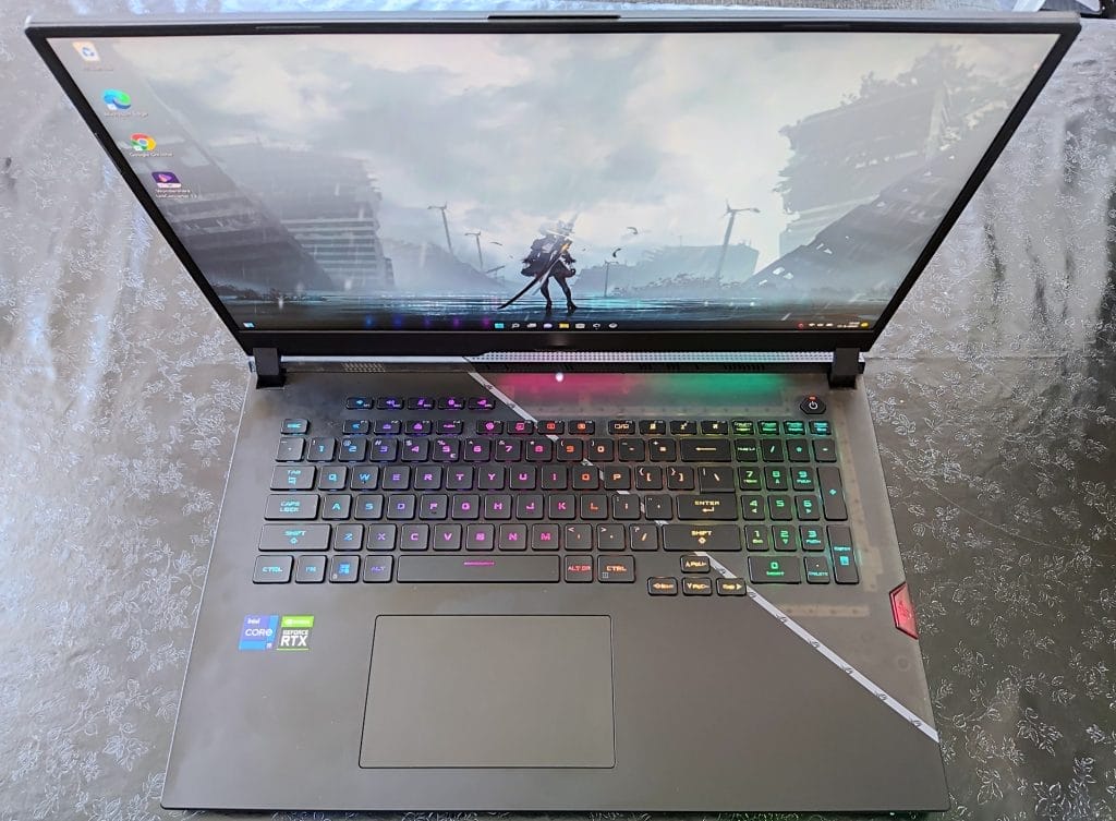 Laten we beginnen bij de specificaties. Ons model is uitgerust met 32GB aan DDR5 RAM-geheugen, 16GB hiervan is gesoldeerd op het moederbord. Voor opslag is hier 2TB aan PCIe 4.0 SSD te vinden. Wat betreft processor bevat de ROG Scar 17, de nieuwste Intel Core i9-12900H van de 12e generatie. De GPU is een Nvidia GeForce RTX 3070 Ti met 8GB aan videogeheugen en een maximale TDP van 150W. Dat is 20W hoger dan de SCAR 17 van afgelopen jaar. De laptop weegt 2.9 KG, wat normaal is voor gaming laptops van dit formaat. Wel is de bijgeleverde 240W oplader best groot. Dat komt omdat de krachtigere CPU en GPU van dit jaar meer stroom nodig hebben voor de beste prestaties.