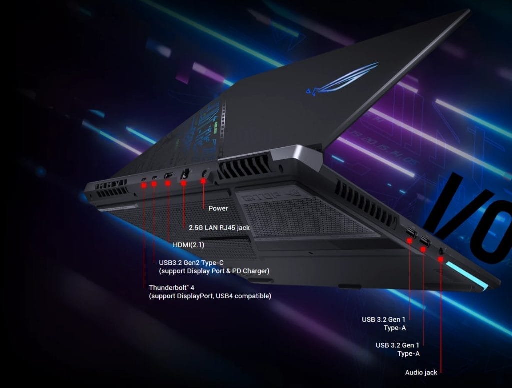 Alle aansluitingen van de ROG Scar 17 SE zijn te vinden aan de achter- en linkerkant van de behuizing. Aan de linkerkant zijn er twee 2x USB-A 3.2 en een 3.5mm headphone jack te vinden. De rest van alle aansluitingen zijn aan de achterkant verwerkt. Dit zijn een power connector, een 2.5G ethernetpoort, HDMI 2.1, USB-C 3.2 Gen 2 en een Thunderbolt 4.0-aansluiting.
