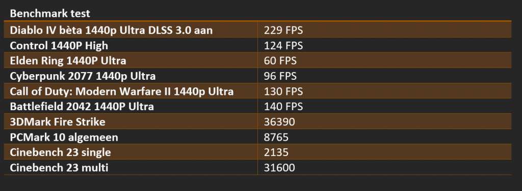 De ROG Scar 18 heeft een 1440p-scherm met een verversnelheid van 240Hz. Je kan dus gamen op maximaal 240 frames per seconde. En aangezien dit een hele krachtige laptop is die ook DLSS 3.0 ondersteund, kan je daadwerkelijk die 240 frames halen. Wij hebben bijvoorbeeld de bèta van Diablo IV gespeeld op 229 fames per seconde op max settings met DLSS ingeschakeld op balanced.