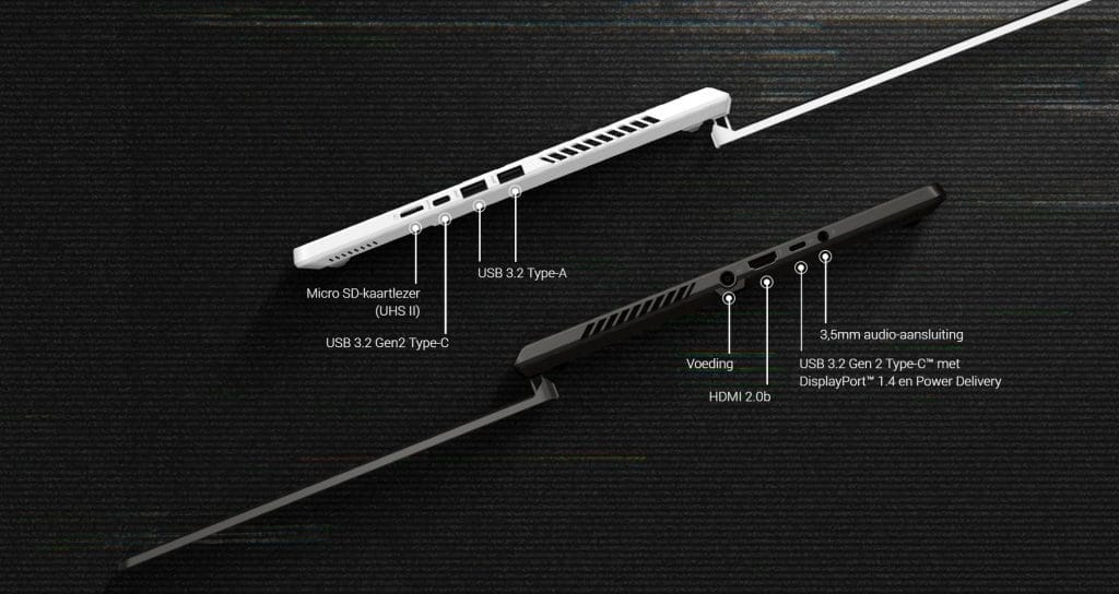 Ondanks een kleine behuizing, heeft de ROG Zephyrus G14 veel aansluitingen. Deze zijn allemaal aan de zijkanten te vinden. De achterkant van de G14 heeft geen aansluitingen. Aan de rechterkant is de G14 uitgerust met 2x USB-A 3.2, 1x USB-C 3.2 en een microSD-kaartlezer. Laatstgenoemde is goed om te zien, vooral als je een content creator bent. De snelheden zijn ook goed met een gemiddelde snelheid van 150 MB/s.