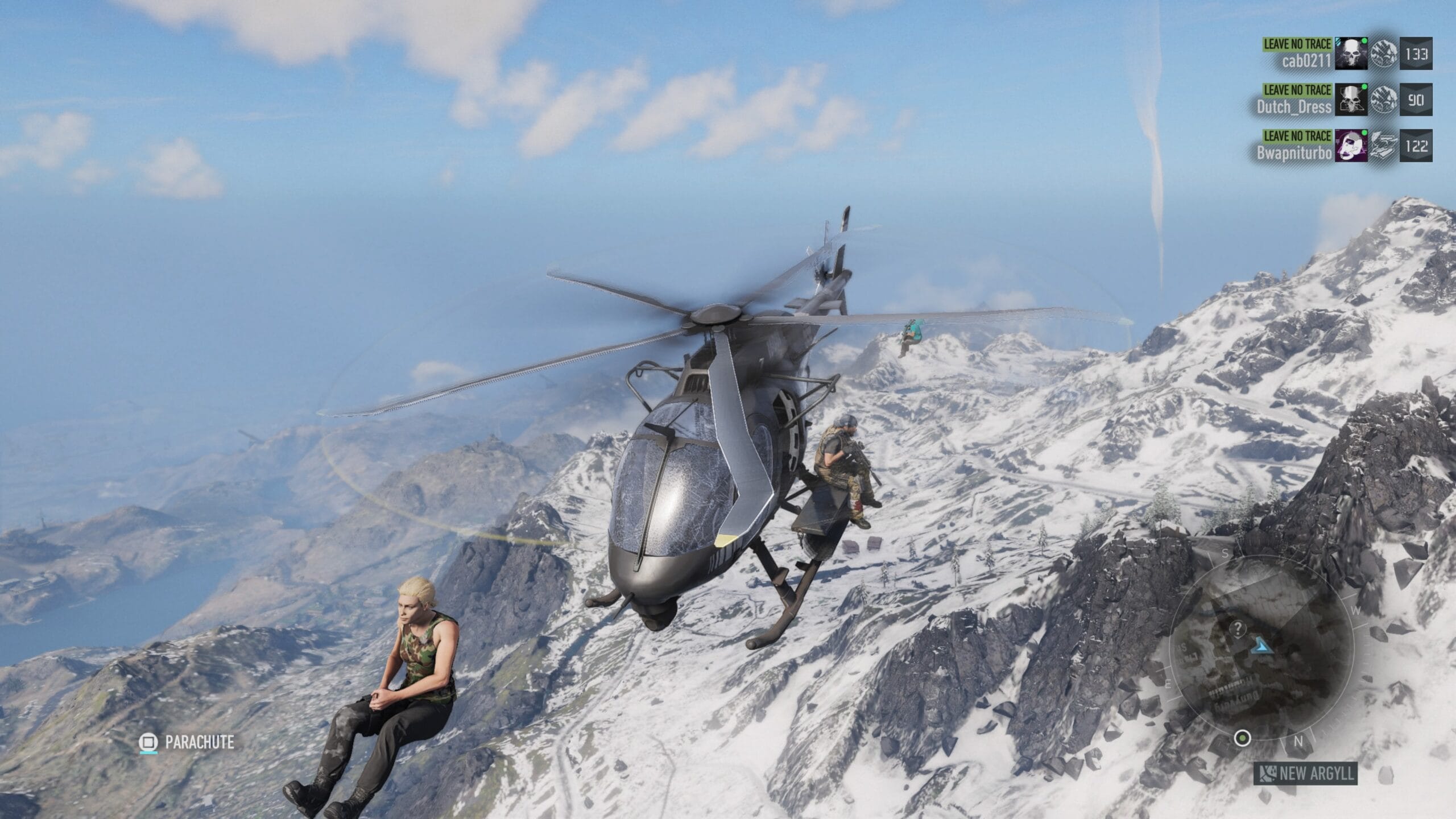 Zijn dit dan de enige negatieve punten aan de game die niet realistisch overkomen? Zeer zeker niet, zelf de lipsync in de cutscenes klopt voor geen kant, waar je op den duur gewoon zwaar aan gaat irriteren. En dan zwijgen we nog over de vele bugs die we tegen zijn gekomen tijdens de uren die we al in Breakpoint hebben zitten. In de lucht blijven hangen tijdens een valpartij, intel niet kunnen pakken door een ammo pack die ernaast ligt die maar ammo blijft geven. Misschien zelfs de grappigste van allemaal, in co-op in een helikopter vliegen is het blijkbaar lastig om ervoor te zorgen dat de andere in je helikopter ook daadwerkelijk in je helikopter zitten. Zoals je kan zien op de onderstaande afbeelding, genoten mijn medespelers van een fris windje voor en achter de helikopter. Zo zijn we nog vele andere bugs tegen gekomen en vragen we ons af of Ubisoft niet beter de game een jaar later kon uitbrengen. Waar wij ons eveneens mateloos aan konden irriteren, was de camera. Vooral op het moment dat je snel via de rechterkant 180 graden wilt draaien, gaat dit soms ontzettend traag waardoor je al snel toch via links gaat. Waar dit aan ligt weten wij ook niet, maar ditzelfde probleem ondervonden wij ook al bij The Division 2.