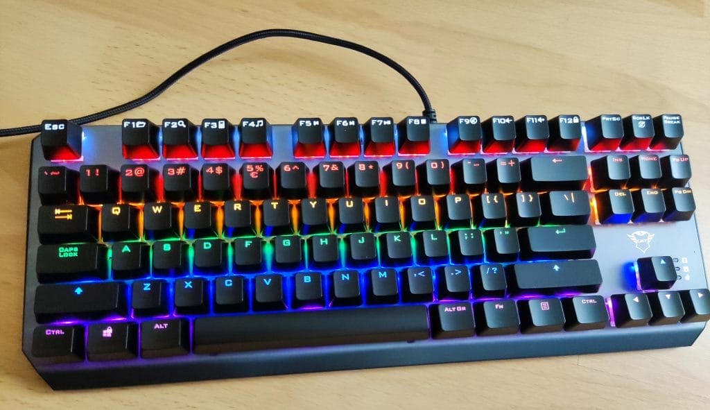 Wat direct opvalt aan de Trust GXT Callaz is dat het een TKL lay-out heeft. Een full-size keyboard met numpad is een volledig toetsenbord. Zonder de numpad krijg je TKL, ook wel bekend als een tenkeyless lay-out. Veel mensen gebruiken vandaag de dag de numpad niet, en daarom zijn TKL-toetsenborden steeds populairder geworden. Het voordeel is dat je meer ruimte krijgt op je bureau waardoor je meer perhiperals kan plaatsen. Ook kan een TLK-toetsenbord zorgen voor meer ruimte voor je muis. Gamers zullen dit waarderen, want soms moet je behoorlijk veel bewegen met je muis om bijvoorbeeld een precieze headshot te kunnen nemen in een multiplayer shooter.
