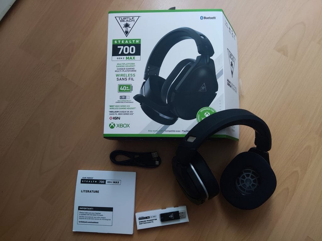 De doos van de Turtle Beach Stealth 700 Gen 2 MAX is vrij simpel. Verwacht hier geen premium unboxing-ervaring. Je opent de doos en middenin is de headset te zien. Daaronder is er een USB-C-oplaadkabel te vinden, een dongle voor draadloos verbinden en alle handleidingen.