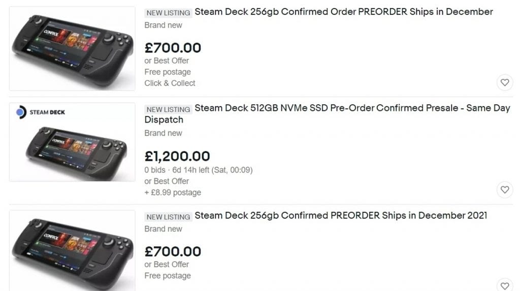 Scalpers hebben al pre-orders geplaatst op de Steam Deck en zijn nu al begonnen met het verkopen op Ebay. De goedkoopste versie van de Steam Deck met 64GB interne geheugen heeft een prijskaartje van €419, maar op Ebay worden er voor de goedkoopste versie, een bedrag van 700 Britse Pond gevraagd, dat is omgerekend €817. De duurdere versies met 256GB opslagruimte krijgt vraagprijzen op Ebay van meer dan €1400.