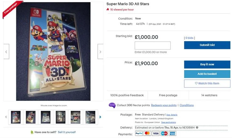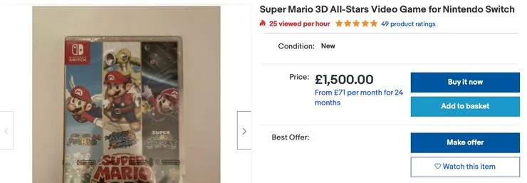 Op Ebay zijn er al enkele scalpers actief die duizenden euro’s vragen voor een fysieke versie van Super Mario 3D All- Stars, Deze game hebben ze gekocht voor €59,99 per stuk. Eén persoon vraagt zelfs $25000 voor de game inclusief officiële factuur. In de afbeeldingen hieronder zijn enkele advertenties van scalpers die behoorlijke willen profiteren te zien.