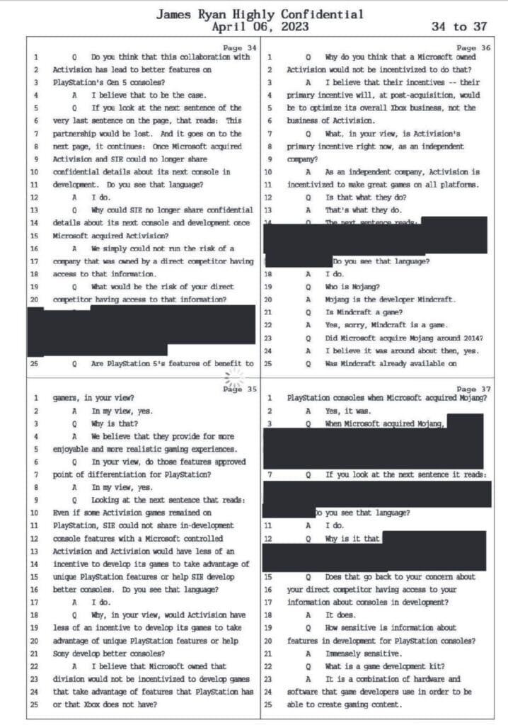 “In an FTC v MS/ABK deposition, PlayStation chief Jim Ryan said that, if deal closes, Sony couldn’t tell Activision about its next console Is then asked about Sony working with Mojang (Minecraft) after MS bought them. Discussion is redacted but Ryan says it supports this concern.”
