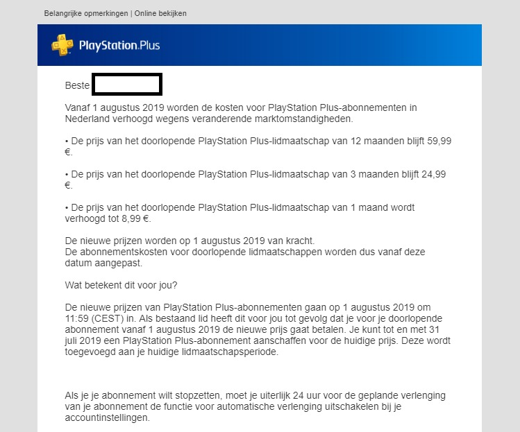 Twee jaar geleden steeg de prijs van een jaarabonnement op PlayStation Plus van €49,99 naar €59,99. Nu laat Sony via een e-mail aan PlayStation Plus-gebruikers weten dat vanaf 1 augustus 2019 de prijzen van een maandabonnement op PlayStation Plus verhoogd zal worden.