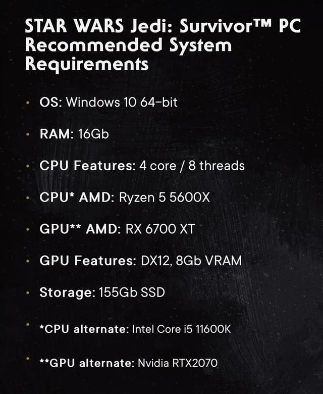 Ontwikkelaar Respawn Entertainment heeft namelijk de minimale en aangeraden PC-systeemeisen bekendgemaakt. Deze zijn hieronder weergegeven. Wat vooral opvalt is de benodigde opslagruimte om deze game te kunnen installeren. Star Wars: Jedi Survivor heeft 155GB aan opslagruimte nodig, wat behoorlijk veel is.