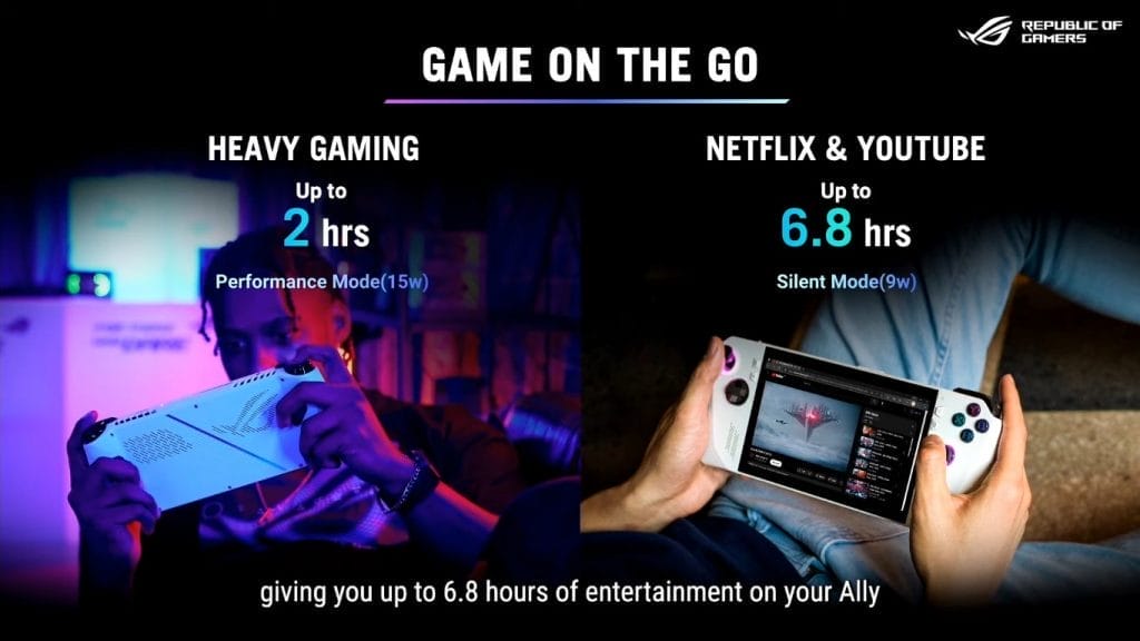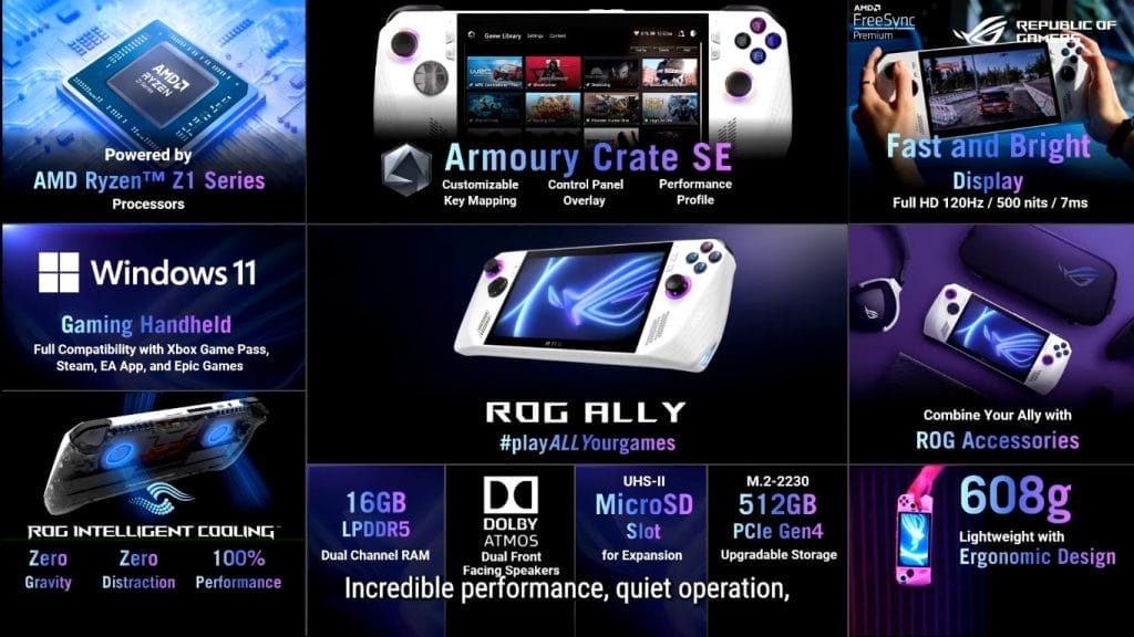 De ROG Ally is uitgerust met een APU van AMD die speciaal is ontwikkeld voor deze handheld. De APU is een AMD Ryzen Z1-series processor met RDNA 3-graphics. ASUS claimt dat de ROG Ally tot 20 keer krachtiger is dan de Nintendo Switch en tot 2x vergeleken met de Steam Deck. Het apparaat is ook muisstil door een geavanceerd dual fan koeling systeem. De ROG Ally maakt maximaal 20dBA geluid, terwijl de Steam Deck 43dBa geluid produceert. Er is een ingebouwde PCIe gen 4 SSD en spelers krijgen de mogelijkheid om een SD-kaart te plaatsen voor meer opslag.