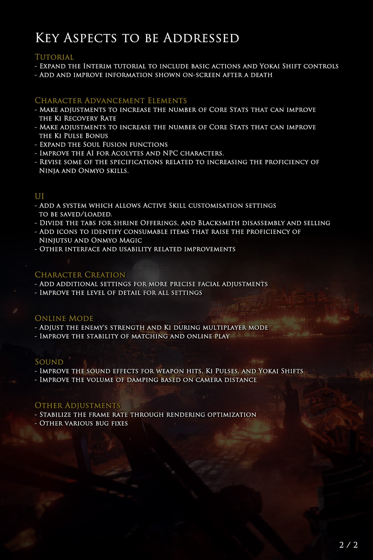 Ontwikkelaar Team Ninja heeft alle big data die is verkregen uit de open bèta en de feedback van fans verwerkt. Daardoor gaat er een hoop veranderen in de finale game die over enkele maanden in de winkels moet verschijnen. In de afbeeldingen hieronder laat Team Ninja alle punten weten die aangepast zullen worden in Nioh 2. Van vijanden, de moeilijkheid, user interface tot character creation. Een heleboel gaat dus op de schop om zo de beste Nioh-ervaring te kunnen bieden aan de spelers.