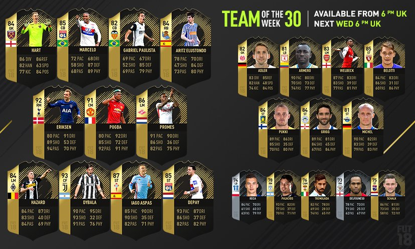 De Team of the Week 30 is zojuist uitgebracht door EA Sports. Het team komt grotendeels overeen met de verwachtingen begin deze week. Twee Nederlanders maken onderdeel uit van het Team van de Week, daarnaast zitten ook Pogba, Eriksen en Dybala in het team.