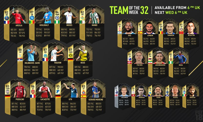 Het Team van de Week 32 zojuist bekend gemaakt door EA Sports. In het team zitten weer een aantal heerlijke kaarten! Onder andere Moses (84), Reus (87) en Lacazette (86) zijn opgenomen in het team. Er zit met Jahanbakhsh ook een Eredivisie-speler in. Verder vinden we ook oud-Ajacied Viktor Fischer terug in het TOTW.