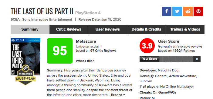 Hierdoor werd de game plots heel hard naar beneden gehaald en staat de gemiddelde score op amper 3,9. Een zeer groot deel van de mensen die deze score gaven, hebben de game overigens ook niet gespeeld. Zij lazen enkele spoilers en vonden daarom dat The Last of Us Part II een game is dat enkel maar een 0 of 1 op 10 waard is.