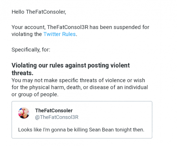 Spelers die Sean Bean echter bedreigen te vermoorden in Hitman 2 op Twitter moeten wel opletten want Twitter neemt bedreigingen heel serieus. Zo is een gamer genaamd @TheFatConsol3R verbannen van Twitter omdat hij in een Tweet schreef: “Het lijkt erop dat ik Sean Bean vanavond ga omleggen”. Het bedreigen van mensen op Twitter is tegen de regels. Hieronder is een mail van Twitter naar @TheFatConsol3R te lezen.