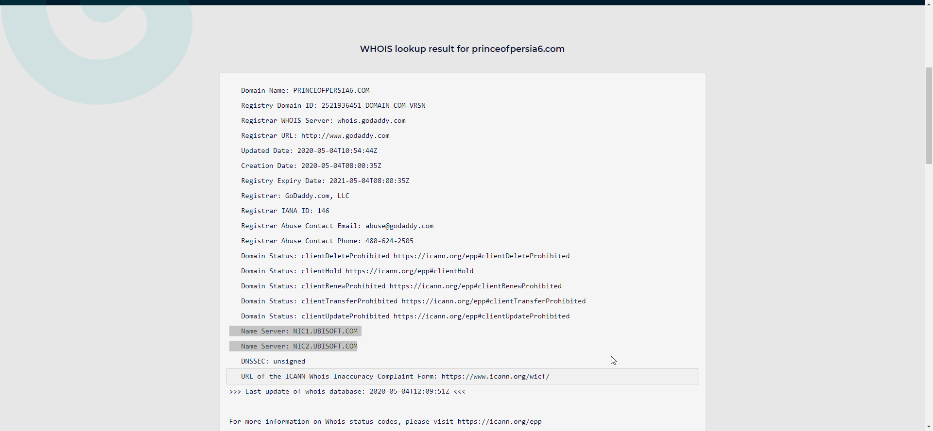 Het bedrijf Godaddy heeft afgelopen dag een interessante domeinnaam geregistreerd namelijk princeofpersia6.com. Godaddy is niet het bedrijf dat normaal domeinnamen registreert voor Ubisoft, dat is Ghandi.net. Laatstgenoemde registreerde afgelopen week nog Assassin’s Creed Valhalla. Wel zien we dat de nameserver van Prince of Persia 6 staat op Ubisoft.com, wat mogelijk kan betekenen dat het hier gaat om een echte Ubisoft-website.