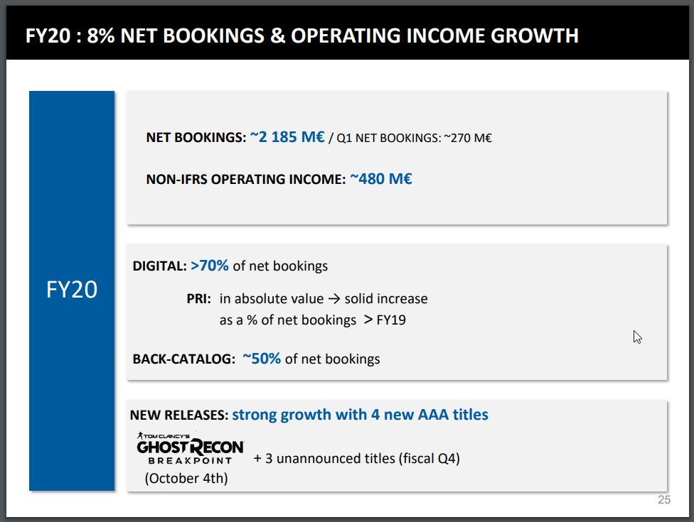 Verder laat Ubisoft weten dat er dit fiscale jaar (tot eind maart 2020), naast Tom Clancy’s Ghost Recon Breakpoint, nog drie onaangekondigde Triple A-games moeten gaan verschijnen. Wat deze games precies gaan zijn, weten we mogelijk pas op de E3. De grote Ubisoft E3-presentatie staat gepland op 10 juni 2019 om 22:00 uur Nederlandse tijd. Geruchten gaan dat Ubisoft werkt aan een nieuwe Splinter Cell-game en Watch Dogs 3.