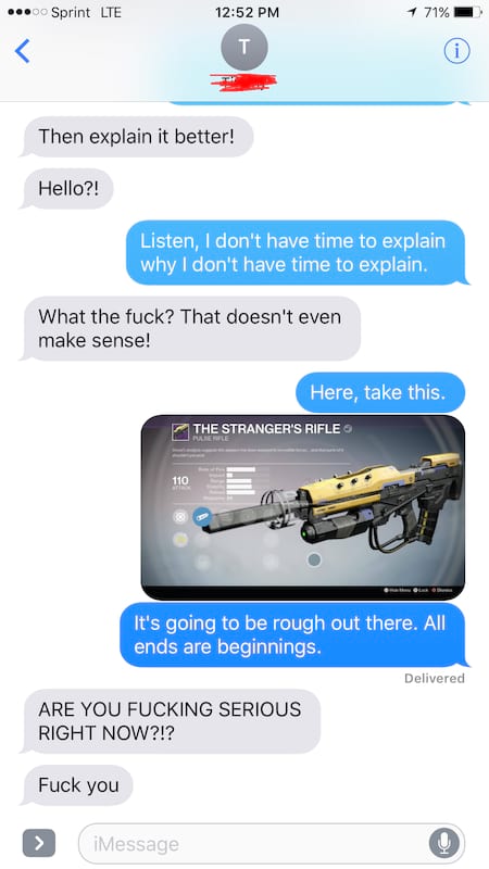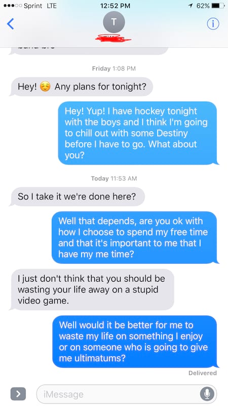 Hij was gedurende een maand samen met zijn gloednieuwe vriendin en alles ging behoorlijk goed, maar ze was geen al te grote fan van games. Toen ze op een avond hem alweer opeiste terwijl hij eens een keertje wou gamen, legde ze hem het ultimatum voor: zij of Destiny. Het antwoord van de gamer was kort maar heel krachtig.