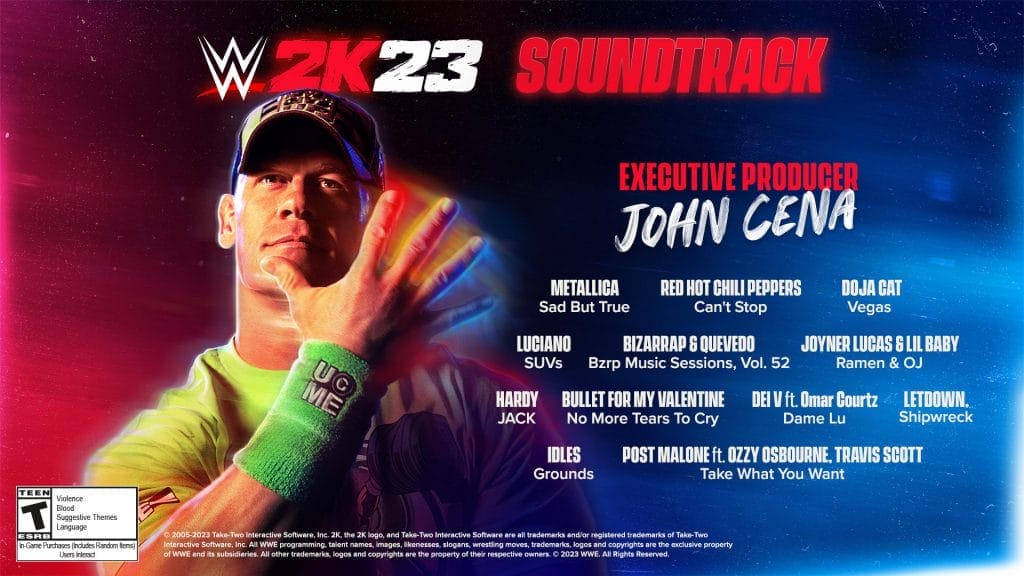De coverster van WWE 2K23 is niemand minder dan John Cena. In de game kan je zijn WWE-carrière helemaal spelen met alle ups en downs. John Cena heeft verder ook gezorgd voor de soundtrack van WWE 2K23. De onderstaande tracks zijn te beluisteren in WWE 2K23 en zijn de favorieten van John Cena. Via Apple Music kan je de WWE 2K23 playlist nu alvast beluisteren.