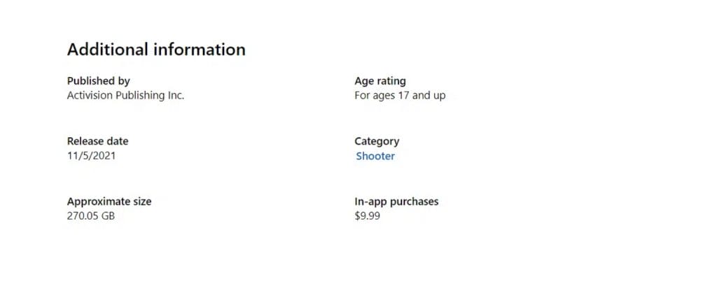 Inmiddels is er een Windows Store-pagina geopend waar iets opmerkelijks staat. Bij het stukje verwachte opslaggrootte, staat er dat deze game maar liefst 270 GB van je kostbare opslagruimte in beslag gaat namen. De SSD van de PlayStation 5 heeft maar 670 GB aan beschikbare ruimte voor de gebruiker. Als je Call of Duty: Vanguard hierop installeert, is je hardschijf voor een groot deel dus vol.