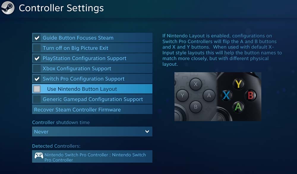 Hier kan je er zelfs voor kiezen om een Nintendo button layout die je al gewend bent te gebruiken, dus X, A, B, Y of over te schakelen naar een Xbox-mapping naar Y, B, A, X. Je controller wordt nu herkent binnen Steam en is volledig bruikbaar voor alle games die een ondersteuning hebben voor een controller. Het is zelfs mogelijk om vibratie en de gevoeligheid van de analoge sticks van de Nintendo Switch Pro-controller aan te passen via Big Picture Mode.