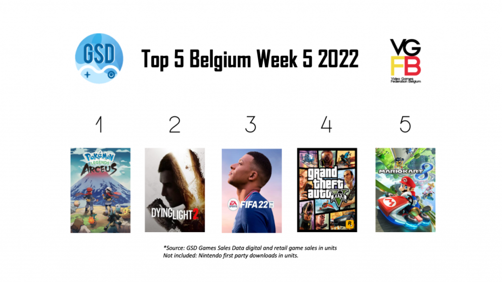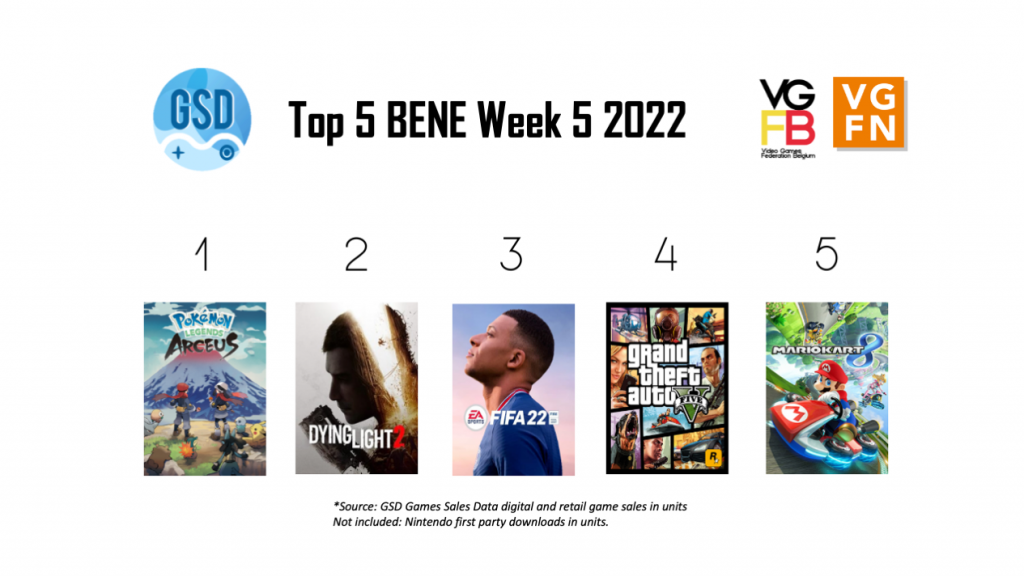 In week 5 van 2022 is de top 5 van de Benelux gelijk aan die van alleen België. De Nintendo Switch-exclusieve Pokémon Legends Arceus staat op nummer 1. De game verkoopt heel goed en wist in de eerste week van lancering wereldwijd 6.5 miljoen exemplaren te verkopen.