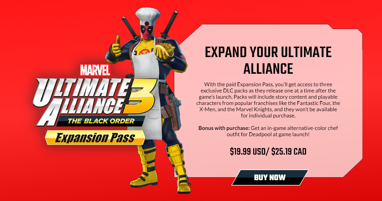 Na launch zal de game voorzien worden van gloednieuwe content. Hiervoor moet je de season pass kopen die €19,99 zal kosten. De DLC zal wederom verhaalgedreven zijn met een focus op de X-Men, Fantastic Four en Marvel Knights. De season pass zal verder gloednieuwe personages bevatten waardoor het totaal nog meer wordt. Wel is het belangrijk om te weten dat uitbreidingen niet los te koop zullen worden aangeboden. Spelers moeten om de DLC te spelen, de season pass aanschaffen.