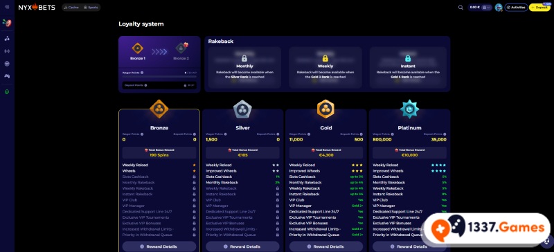 Het VIP-programma van casino zonder limiet NYXbets Casino is opgezet om zowel frequente spelers als echte highrollers extra te belonen. Denk aan persoonlijke bonussen, hogere limieten en snelle uitbetalingen. Vanaf het moment dat je begint te spelen, kun je punten verzamelen voor je VIP-status. Hoe meer punten je verzamelt, hoe sneller je stijgt en exclusieve beloningen ontvangt.