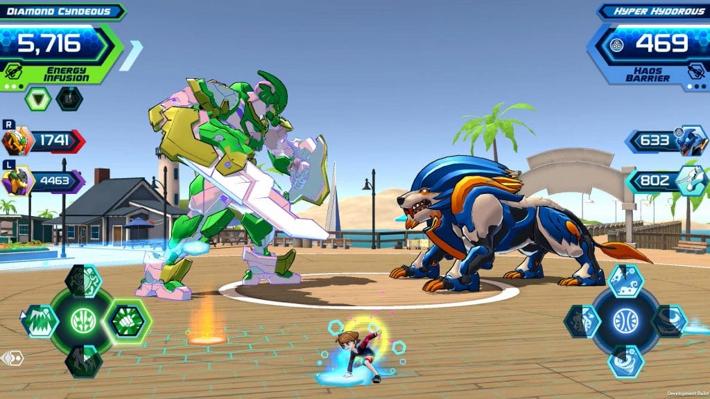 Elke Bakugan behoort tot één van deze attributen en heeft sterktes en zwaktes tegen andere attributen. Een Bakugan met Ventus is bijvoorbeeld zwak tegen Haos en sterk tegen Pyrus. Deze sterktes en zwaktes brengen nog enigszins diepgang in de gameplay met zich mee. Naarmate je echter een groot aantal gevechten achter de rug hebt, wordt de combat helaas wat eentonig. Het is simpelweg niet leuk om te vechten tegen vijanden die constant heals of shields gebruiken. Dit maakt de gevechten soms enorm lang. Daarnaast hadden wij genoeg van bepaalde langdurige animaties toen wij deze voor de zoveelste keer zagen.